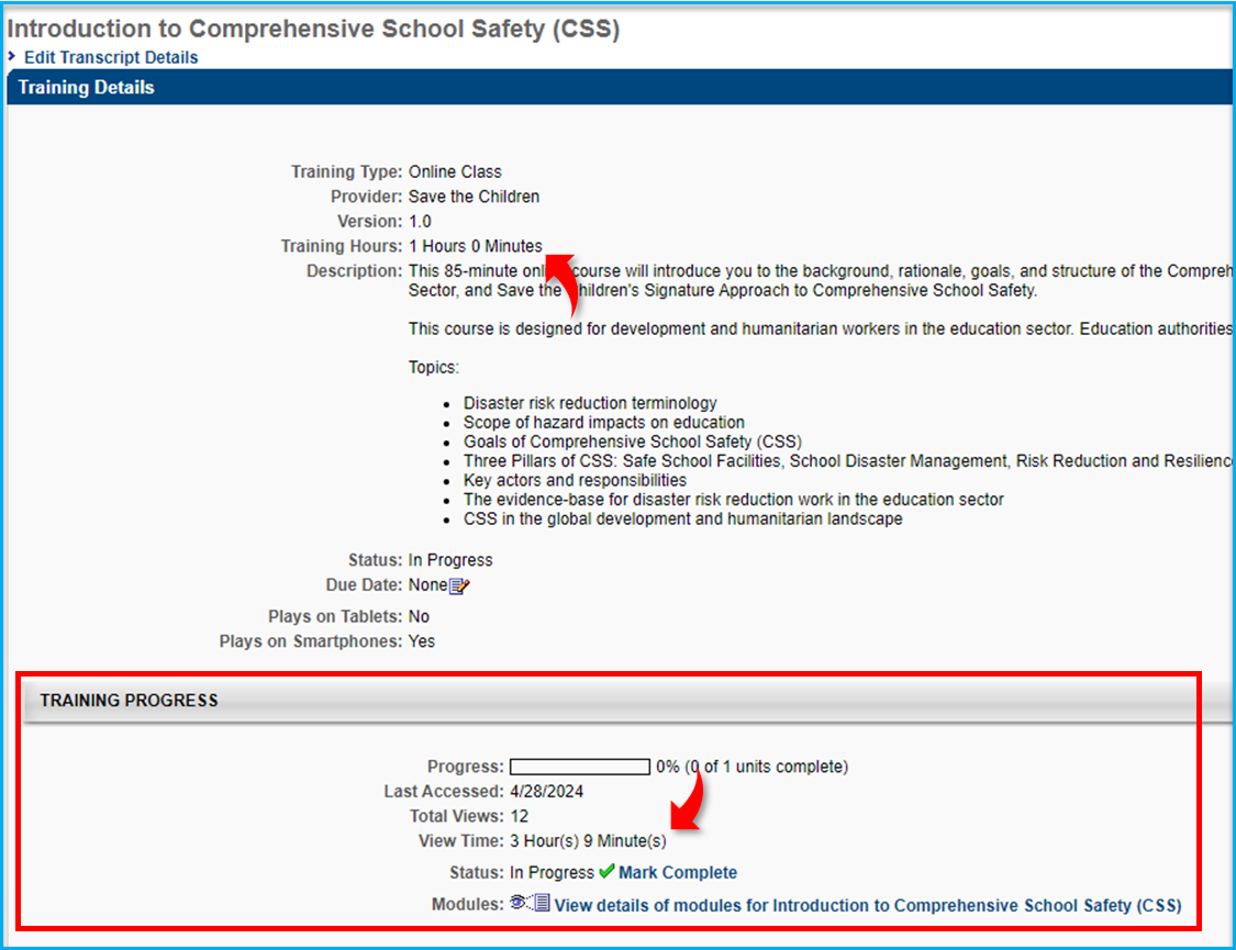 2. Check the course details, specifically the ‘Training Progress’ information in the courses’ training details. Check if the user spent sufficient time in the course. (View Time should be equivalent to or more than the Training Hours)